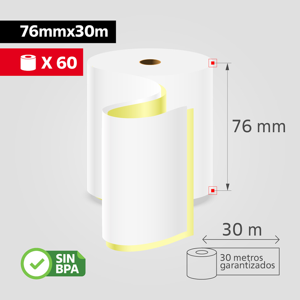 • 2 Hojas (Original + 1 Copia): Muy común para facturas sencillas, comandas o recibos donde solo se necesita un duplicado. El rollo de 76mm x 30m se encuentra frecuentemente en esta presentación.